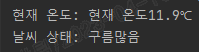 이제 추출한 데이터를 이용하여 예보를 출력합니다. 예를 들어, 현재 온도와 날씨 상태를 출력하는 예제는 다음과 같습니다.
